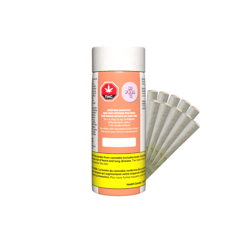 Anytime Smooth CBD Kief Infused Pre-Rolls 10 Pack by hifeelu features 13–19% CBD, <1% THC, and kief-infused craft flower with carbon filters for smooth, non-intoxicating hits.