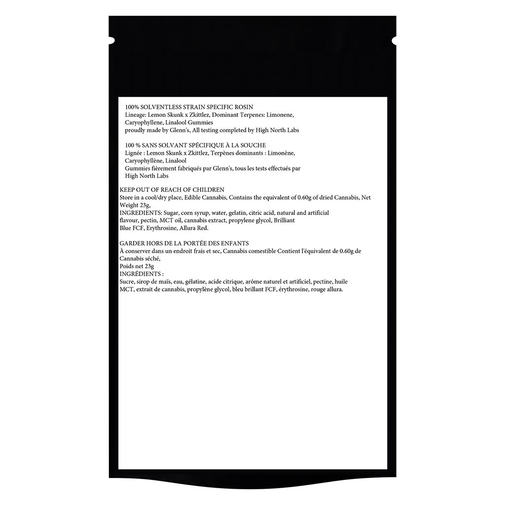 Using premium indoor, whole plant fresh frozen material that was grown by SpeakEasy. These full spectrum hash rosin soft chews are made with 45-189u ice water hash. Then the final stage in the production of the Soft Chews are made by Glenn’s.