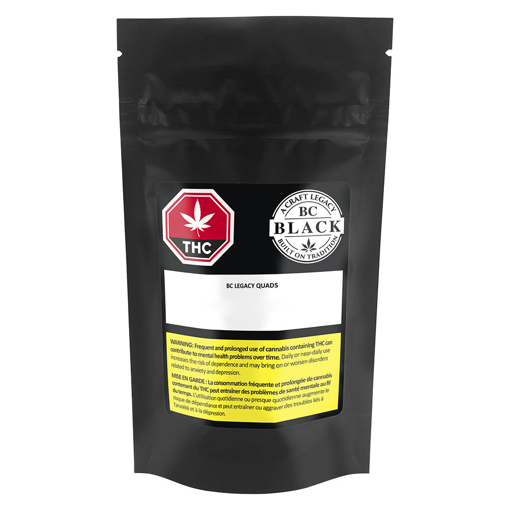 BC Legacy Quads is a rotating sku offering the very best flowers from BC Black’s small batch cultivators. This bud is produced in BC, the epicentre of Canada’s cannabis industry, where the pre-legal market had its deepest roots and where our cultivators got their start as lifetime cannabis entrepreneurs. Only the finest flowers make the cut to be called “quads” and that’s exactly what you can expect from a team that grades cannabis on its nose, bud structure and burn.