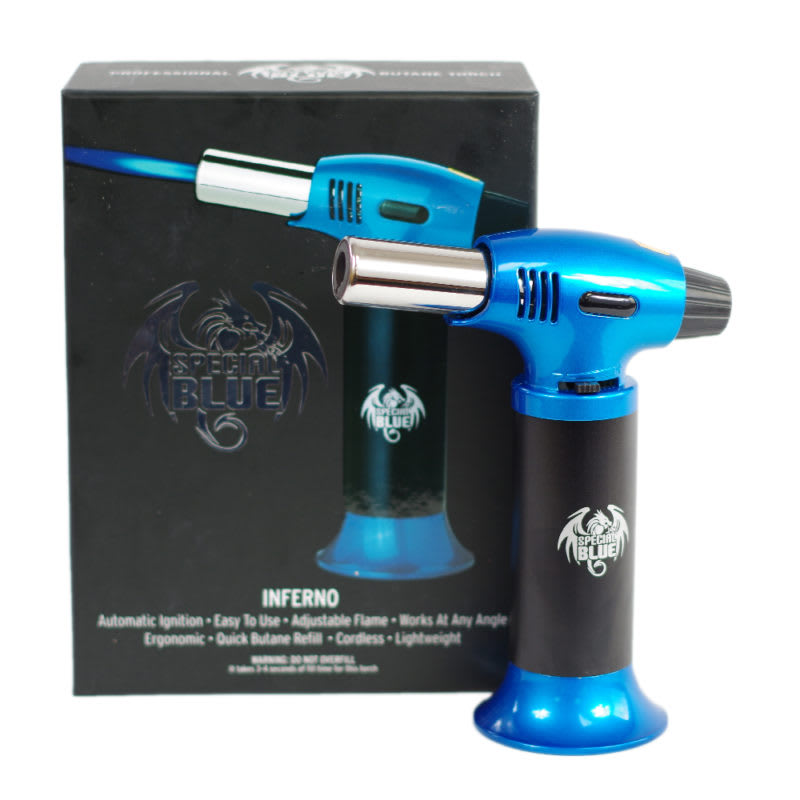 The West Coast Special Blue Torch model stands 6.25″ tall and rests upright on its built-in base. These refillable butane torches features an auto ignition, an adjustable flame with an ergonomic design. This model works at any angle, refills quickly, is cordless and lightweight, and has a lifetime warranty from Special Blue that your customers will appreciate.