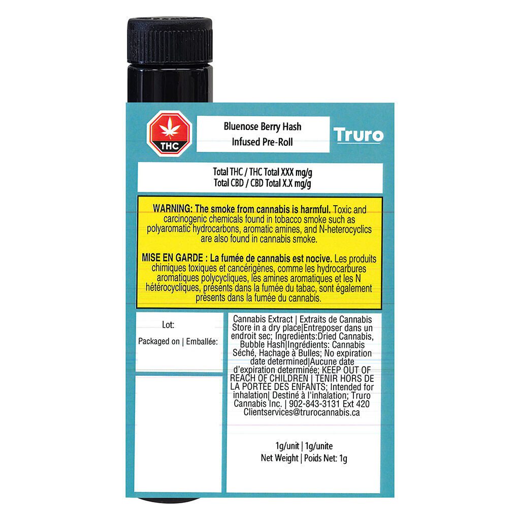 Experience the pinnacle of potency and flavour with the Bluenose Berry Hash Infused Pre-Roll Single by Truro. This expertly crafted 1-gram single pre-roll features a powerful 50/50 blend of high-quality Bluenose Berry Flower and premium, in-house solventless bubble hash for a truly elevated session.