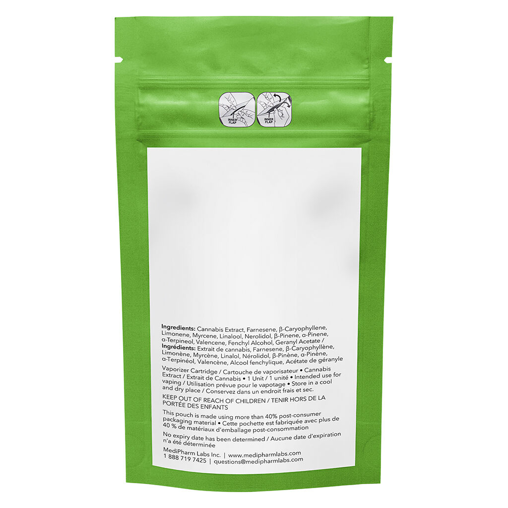 A high CBG and high CBD vape cartridge featuring a blend of natural terpenes to create balanced aromas of crisp apple with an earthy and citrusy profile for a refreshing flavour. Made with a hemp-based mouthpiece and packaged in mylar bags made from more than 40% post-consumer material. Our naturally derived CBG contains no synthetic material.
