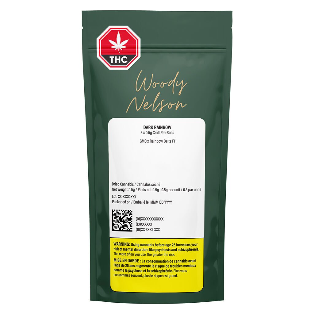 Dark Rainbow Craft Pre-Rolls 3 Pack by Woody Nelson includes 3 x 0.5g indica pre-rolls made with organic living soil cannabis, featuring citrus and funky flavour notes.