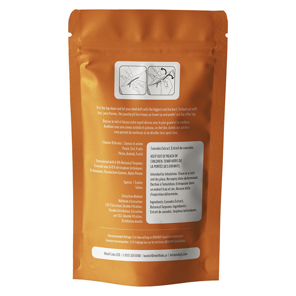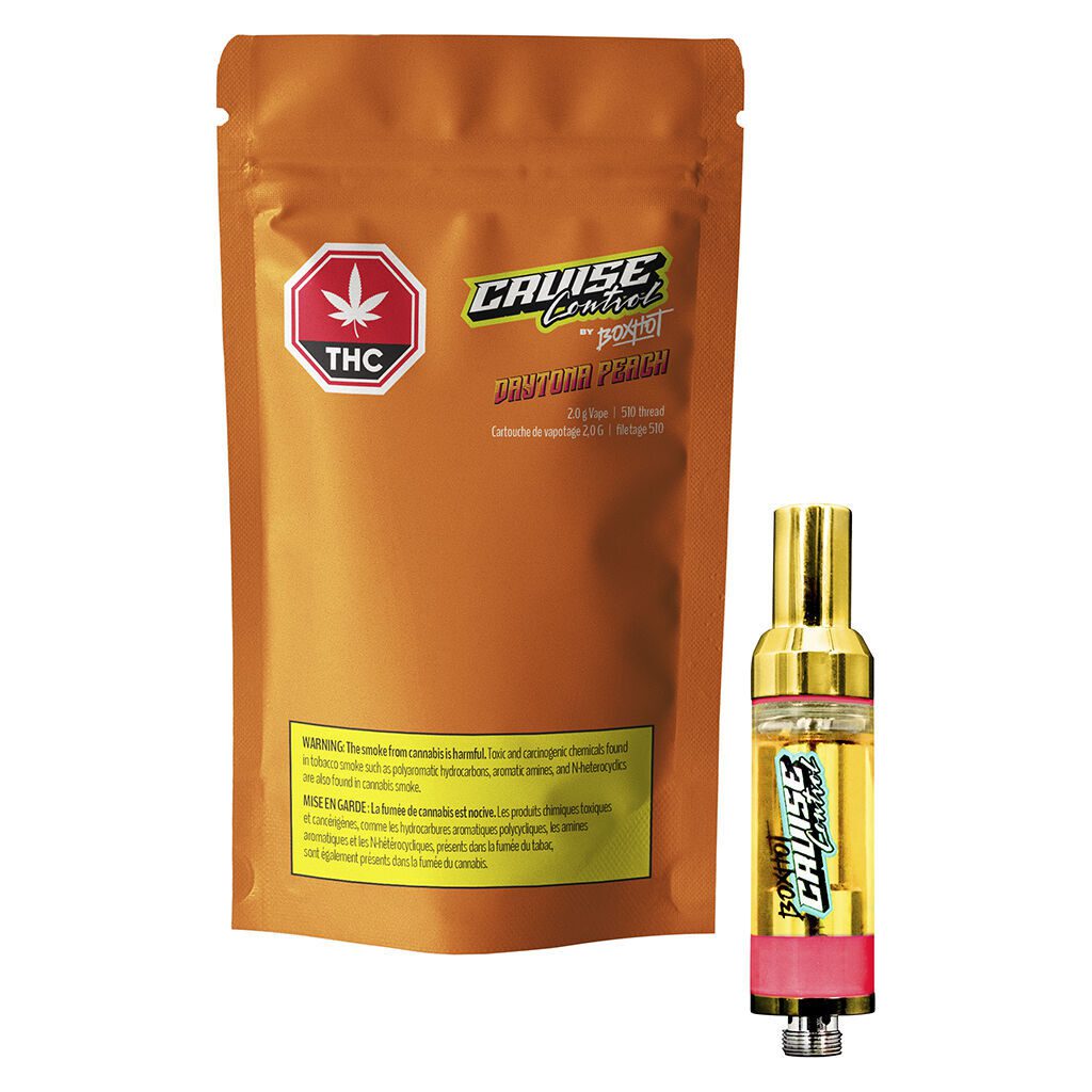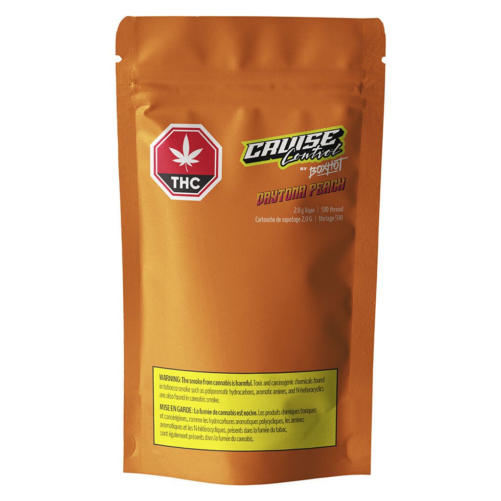 Engineered with oversized hardware for improved airflow and durability, Daytona Peach THC + CBG 510 2g Cruise Control by BoxHot is compatible with most standard 510-threaded batteries and built to perform across the full 2g capacity. Smooth vapour production, bold peach flavour, and consistent cannabinoid delivery make this vape an ideal choice for consumers looking for a high-performance cartridge that goes the distance without sacrificing taste or quality.