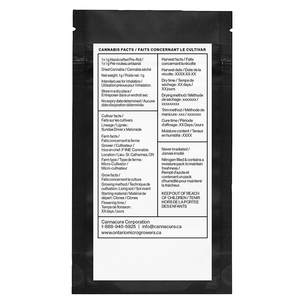 Micro grown in soil by F1NE Cannabis out of St. Catherines, Ontario. Owned and operated by a power couple; Josh and Eleanor. This indica-dominant hybrid is a special cross between Sundae Driver x Melonade. The plant produces potent buds with a strong sweet fruity smell. It boasts a bold sweet candy grape, berry, melon flavour. Milled from whole fresh buds. Elite clones, hang-dried, slow cold cured, hand-trimmed and hand-packaged, the way its always been.