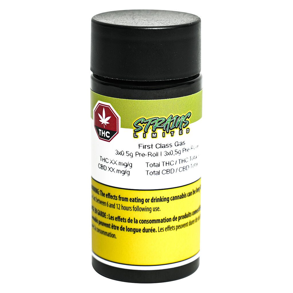 First Class Gas Pre-Rolls 3 Pack by Strains – 3 x 0.5g crafted from First Class Kush x Baby Yoda. Gassy, nutty, creamy, and smooth with high THC potency.