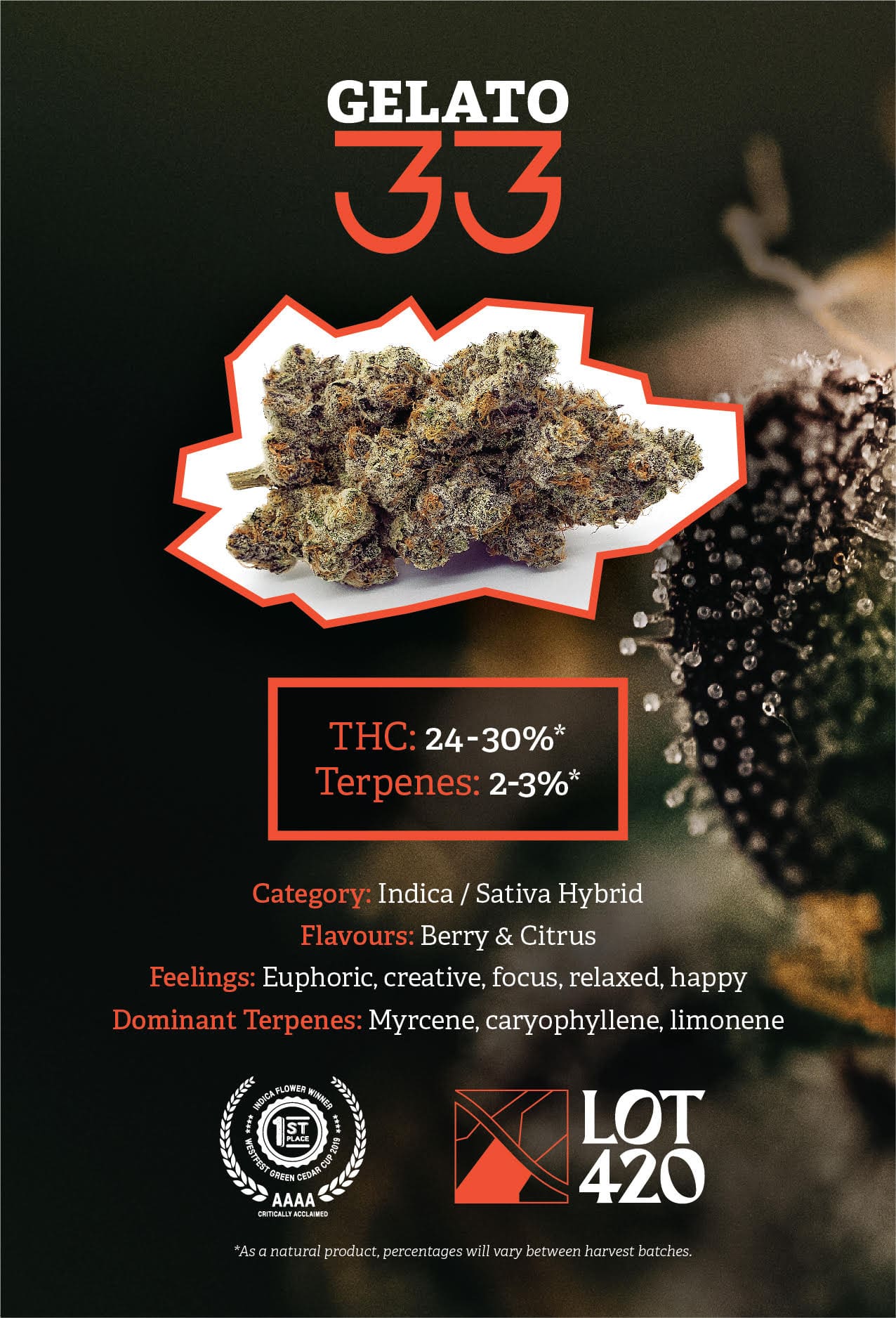 With sweet and citrusy flavours, Gelato #33 (crossing is Sunset Sherbert x Thin Mint GSC) is an indica hybrid. LOT420 is a licensed cannabis producer located in southeast of Montreal in Quebec’s Eastern Townships, focused on producing hand-crafted, select batch, high-grade flower. Using proven methods developed in-house, every batch is thoughtfully cultivated, hang-dried, cured and hand-trimmed to give consumers the highest grade product on the market.
