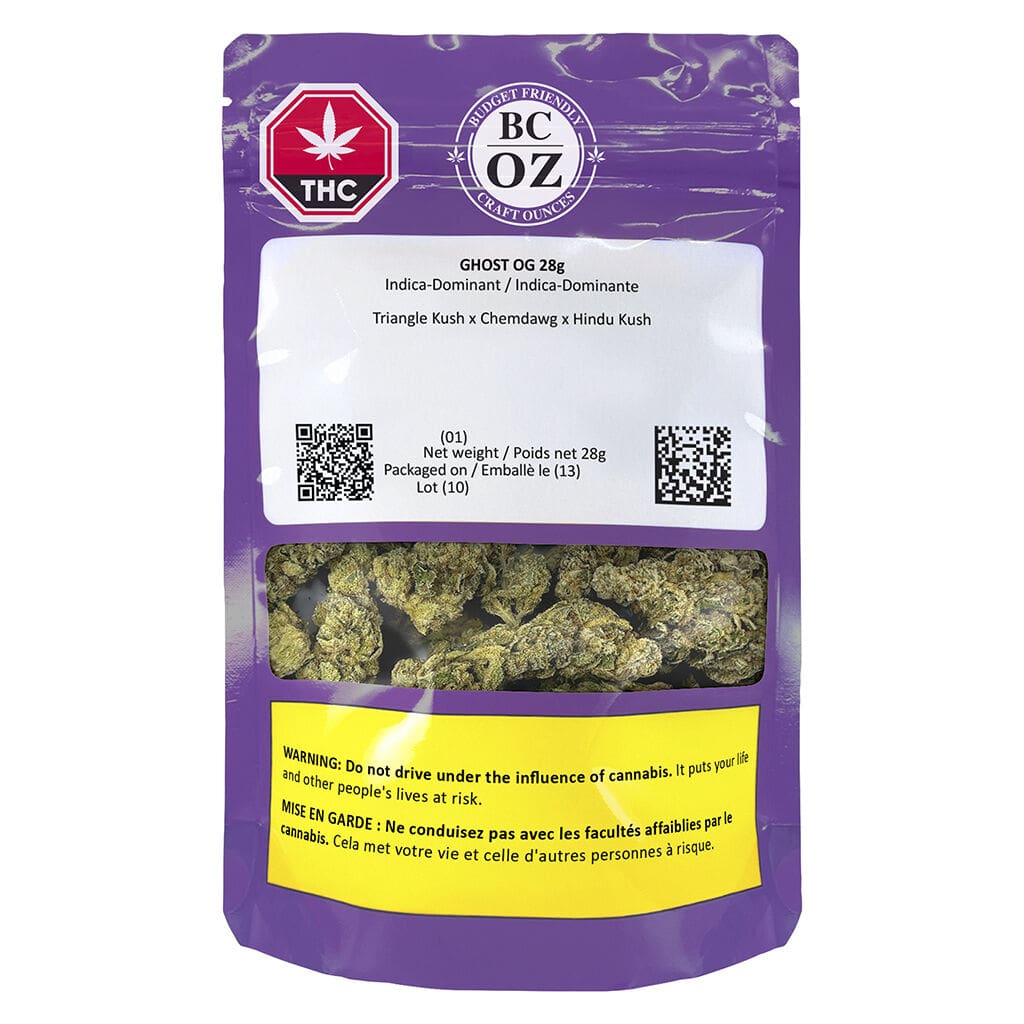 BC OZ Ghost OG (28g) is a high-intensity indica “Big Bag” featuring the legendary Triangle Kush x Chemdawg x Hindu Kush lineage. With a “Very Strong” profile of earthy citrus, pine, and spice, these Big Bags deliver a hauntingly potent Kush experience. Don’t be afraid of the ghost—shop BC OZ Big Bags today.