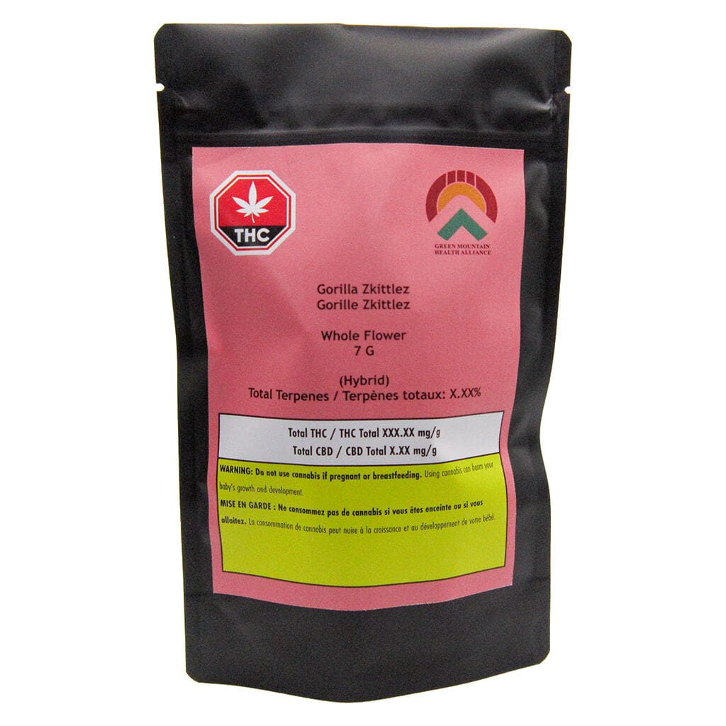 Gorilla Zkittlez 7g by Green Mountain is an indica-dominant dried flower with dense frosty buds, spicy chocolate and herbal flavours, and Original Glue x Zktlz genetics.