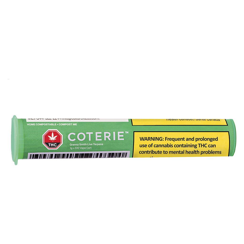 Granny Smith Live Terpene 510 1g by Coterie is a sativa-dominant vape cart combining live resin and distillate for high THC, sour fruit flavour, and full-spectrum terpenes.