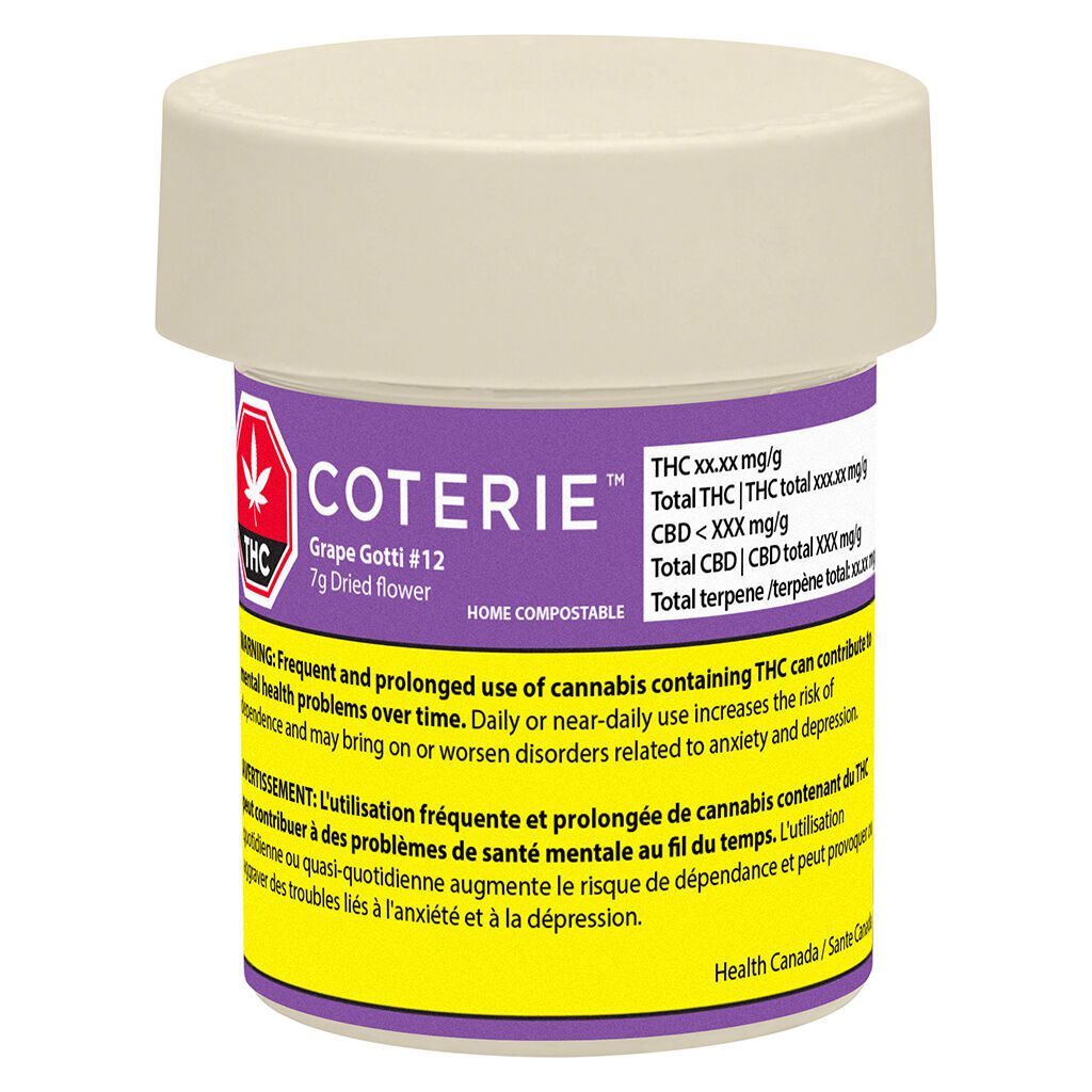 Grape Gotti #12 7g by Coterie is whole dried indica flower with grape, sweet cream, and gas flavours, dense frosty buds, and juicy resin for a smooth, potent smoke.