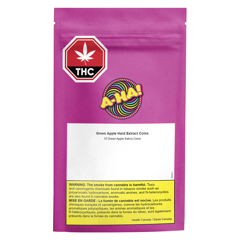 The A-Ha! Hard Extract Coins are a cannabis extract product in a unique, buccal delivery format (cheek asorption) with a sweet & sour green apple flavour. IMPORTANT! Do not swallow, chew or crunch this product. Instead, place it on the inside of your cheek and let it slowly dissolve and absorb in the side of your mouth. Please read the full instructions and details on the product label prior to consuming.