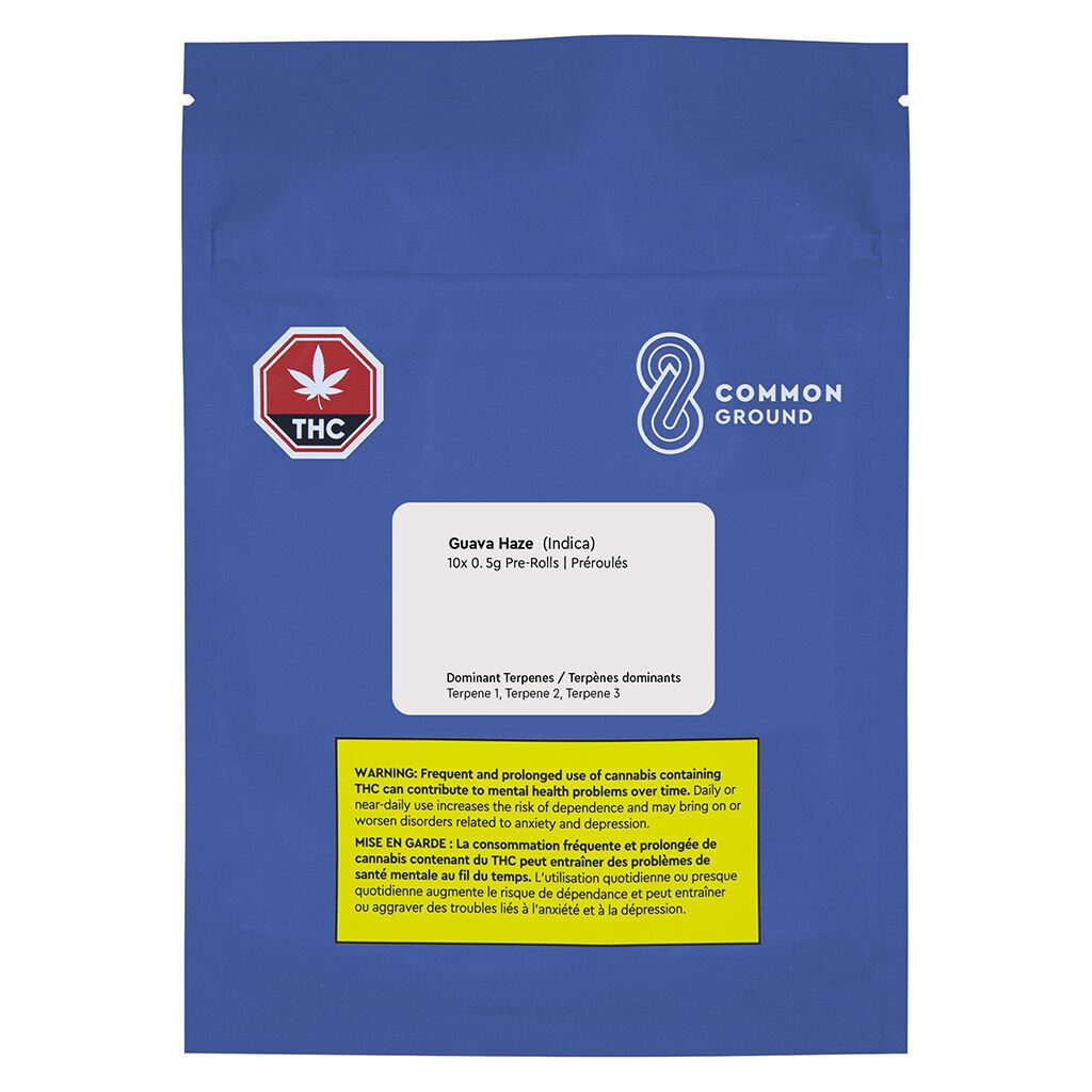 Guava Haze Pre-Rolls 10 Pack by Common Ground includes 10 x 0.5g whole flower pre-rolls with tropical guava, mango, and citrus aromas in an indica-dominant format.