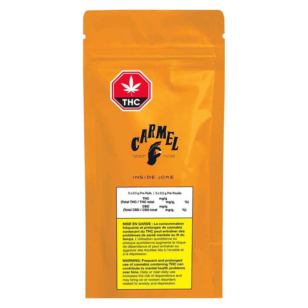 Inside Joke Pre-Rolls 3 Pack by Carmel are indica-dominant joints with whole flower, hard candy, gas, and citrus flavours. Slim cones hand-packaged in glass tubes with cork tops.