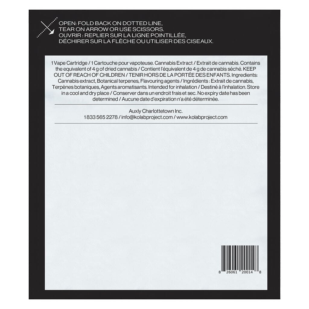 Kolab Project Strawberry Ice Sativa 1.0 g vape cartridges’ flavour profile is influenced by the Strawberry Ice strain and Myrcene is the dominant terpene.
