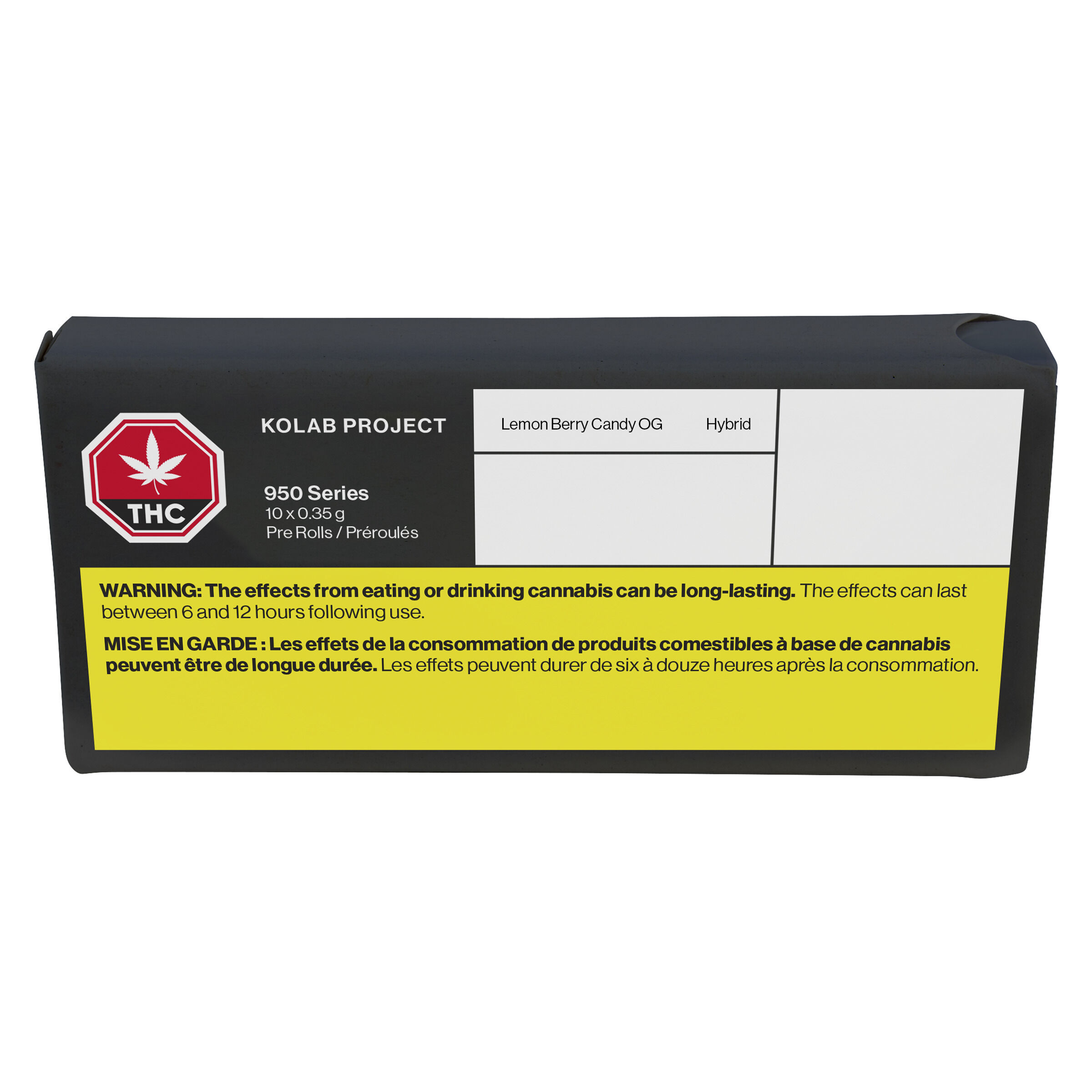 950 Series Lemon Berry Candy OG pre-rolls are a hybrid cross between Lemon Berry Candy OG and Ethos Cookies #16 and boast a THC potency of up to 28%. Indulge in their woodsy, sweet berry aroma and their sweet and sour flavour. The cutting edge of Ancient Technology, Kolab Project pre-rolls always use premium flower and are machine rolled in a striking, smooth-burning black hemp paper. Every pack of Kolab Project pre-rolls is packaged in a biodegradable carton with a post-consumer waste recyclable tray. To ensure the highest quality smoke each and every time, each pack has a freshness seal that can be resealed after opening.