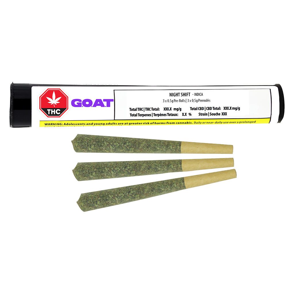 Night Shift Pre-Rolls 3 Pack by G.O.A.T includes 3 x 0.5g Kush-inspired small-batch pre-rolls, hand-trimmed, slow-cured, and hydroponically grown for peak quality.