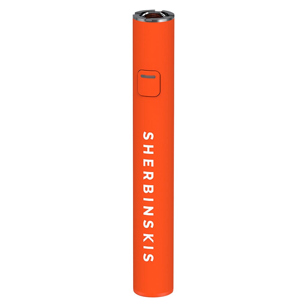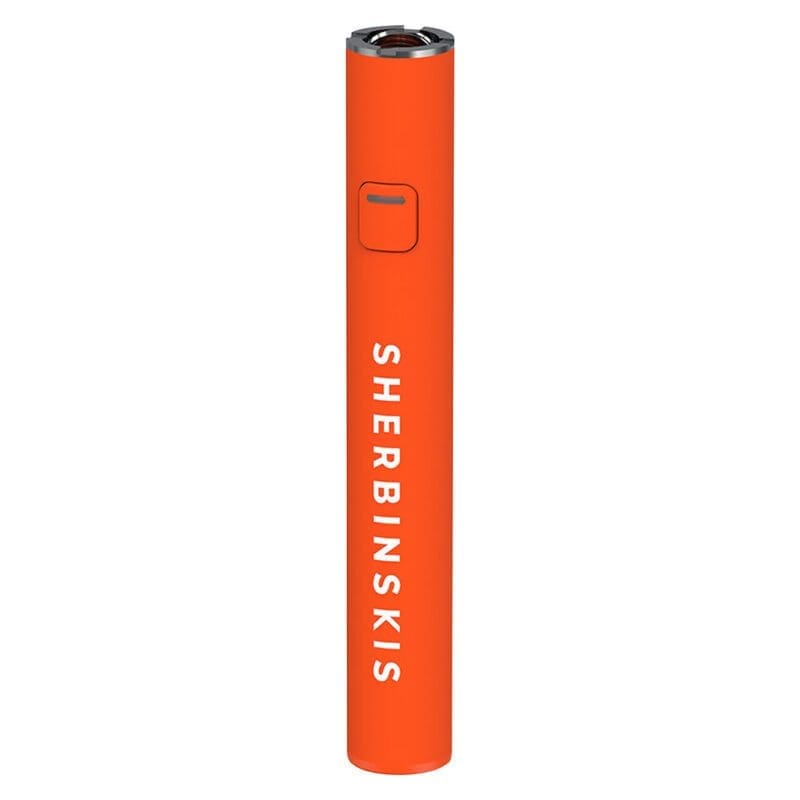 A premium soft-touch 510 battery in Sherbinskis’ trademark Orange hue, the perfect compliment to Sherbinskis’ cartridges. This auto-draw, USB-C rechargeable vape battery has a pre-heat function and multiple voltage settings which allow for ideal performance with either true live resin or distillate based formulations. Click the button 3 times to cycle through voltage settings.