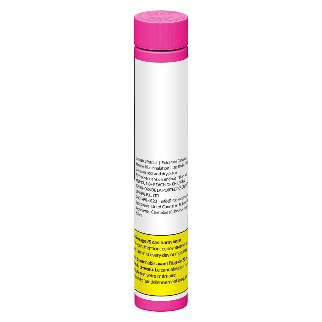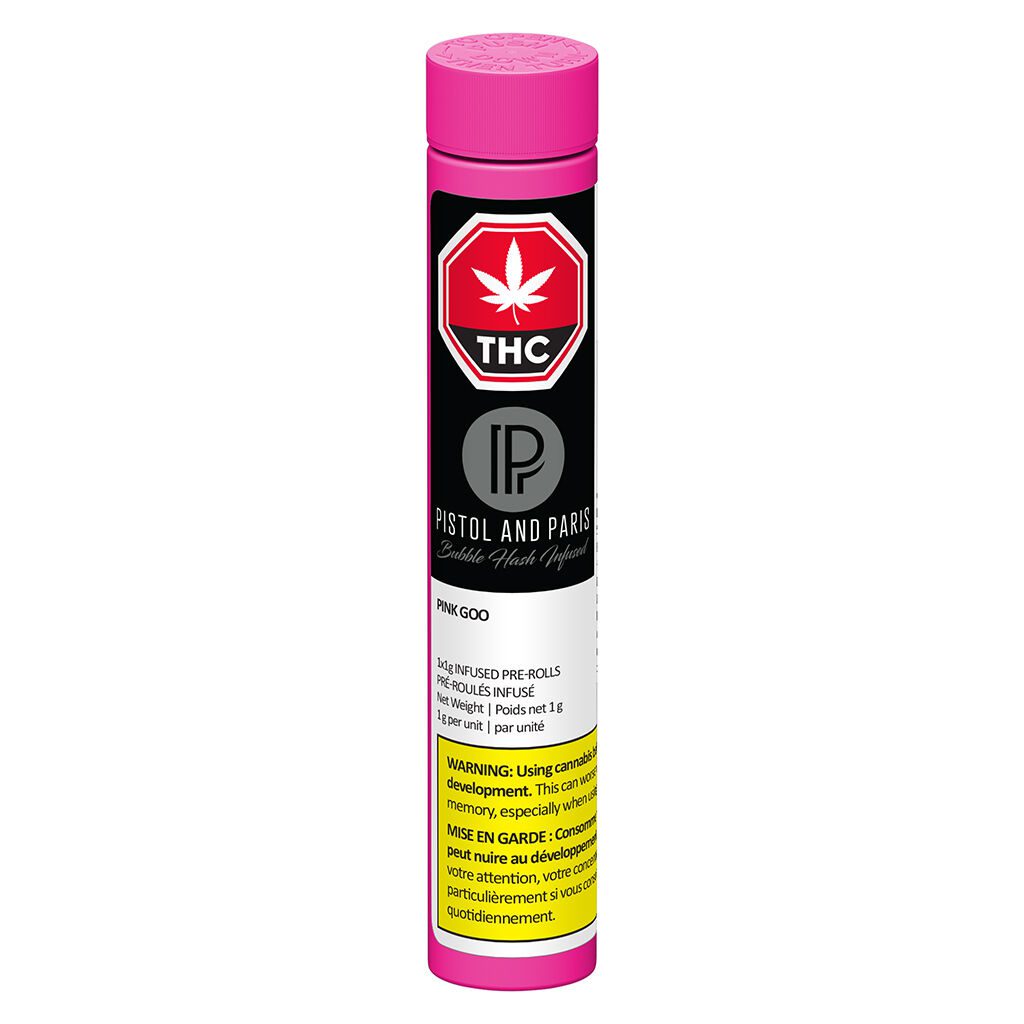 Pink Goo Bubble Hash Infused Pre-Roll Single by Pistol and Paris is a 1g infused pre-roll with Pink Goo whole flower and bubble hash, delivering sweet, earthy, berry, and pine notes.