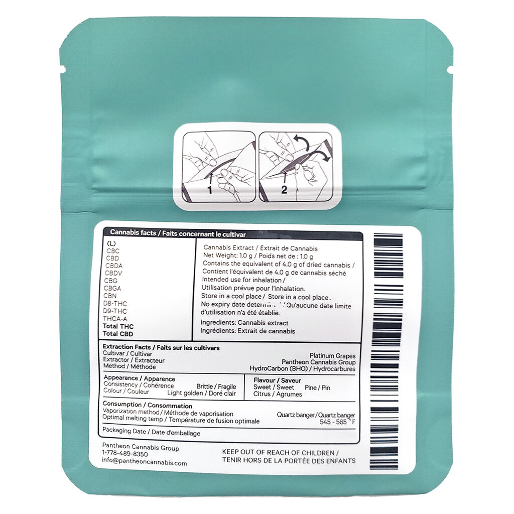 Platinum Grapes is a cross of Platinum Kush and OGKB from Organnicraft. It contains 4-5% overall terpenes with sweet grape and cream flavours from the high levels of farnesene and limonene. We use a blend of whole flower and sugar leaf for the best representation of the plant.