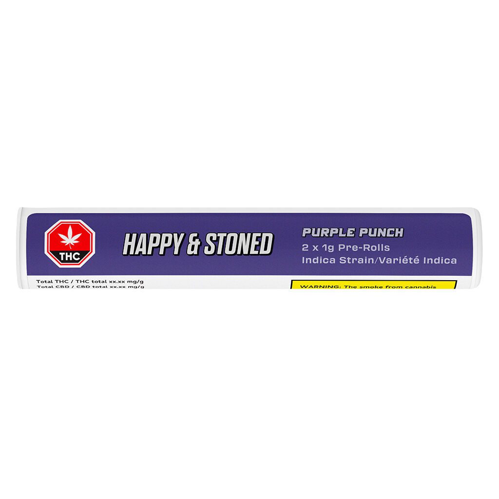 Purple Punch Pre-Rolls 2 Pack by Happy & Stoned features two 1g indica-dominant pre-rolls with sweet grape candy, blueberry muffin, and fruit punch flavours.