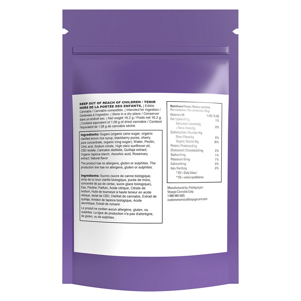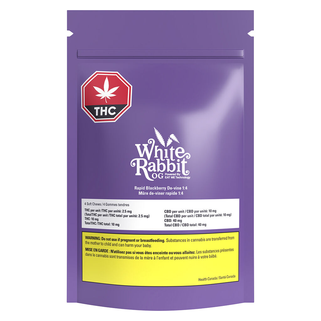 Smell, taste and experience the deep notes of blackberries and dark cherries, and let the full-bodied flavour and aromas of Blackberry Merlot carry you on a flavour-packed adventure. White Rabbit OG soft chews are pectin-based, vegan, and gluten-free, made using only all-natural, Non-GMO ingredients for an entirely plant-based experience. Each package contains four bite-sized soft chews, with 2.5 mg THC and 10 mg of CBD per piece.