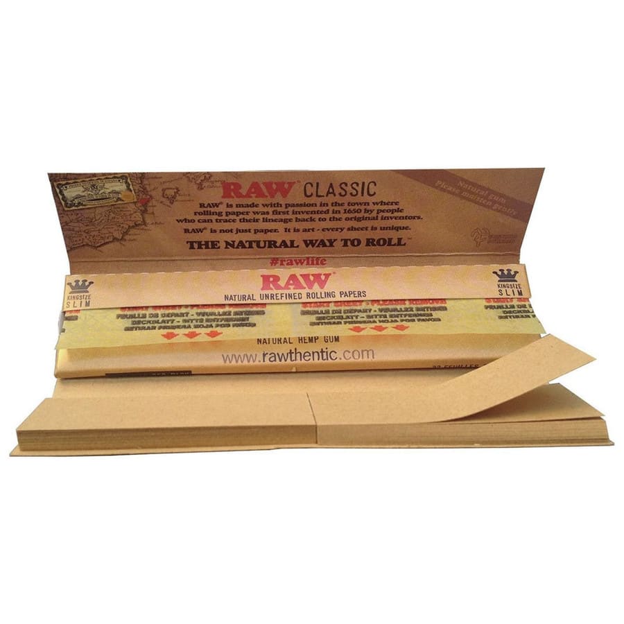 Enjoy a pure, natural smoking experience with RAW Classic King Size Slim Papers with Tips. Made from unbleached, additive-free fibers, these ultra-thin papers feature RAW’s patented criss-cross watermark for an even, slow burn. Each pack includes 32 papers and tips, bound together with a built-in rubber band.
