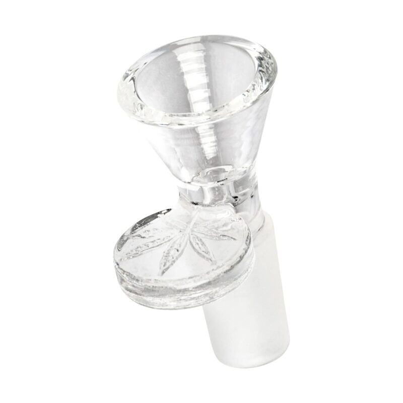 14mm bowl piece made from durable borosilicate glass, featuring a clear leaf stamped disc handle for easy grip and stylish flair.