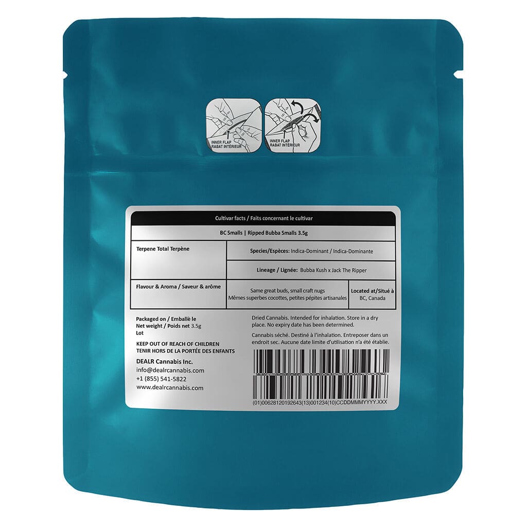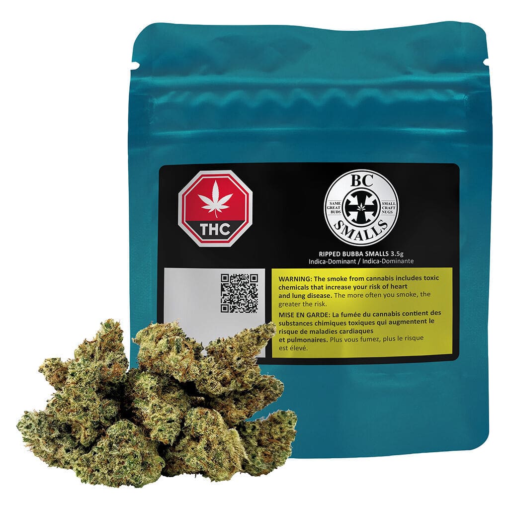 BC Smalls Ripped Bubba Smalls (3.5g) is a high-intensity indica-dominant flower crossing Pre-98 Bubba Kush and Jack the Ripper. With a unique flavor profile of passionfruit, spice, and skunk, these frosty “small” buds deliver a powerful, relaxing high with a classic kush finish. Get ripped—shop BC Smalls today.