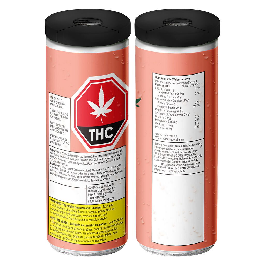 Rosin Infused Peach Black Tea 355ml by TeaPot is a cannabis-infused black tea made with solventless rosin, natural peach flavour, and 10 mg THC.