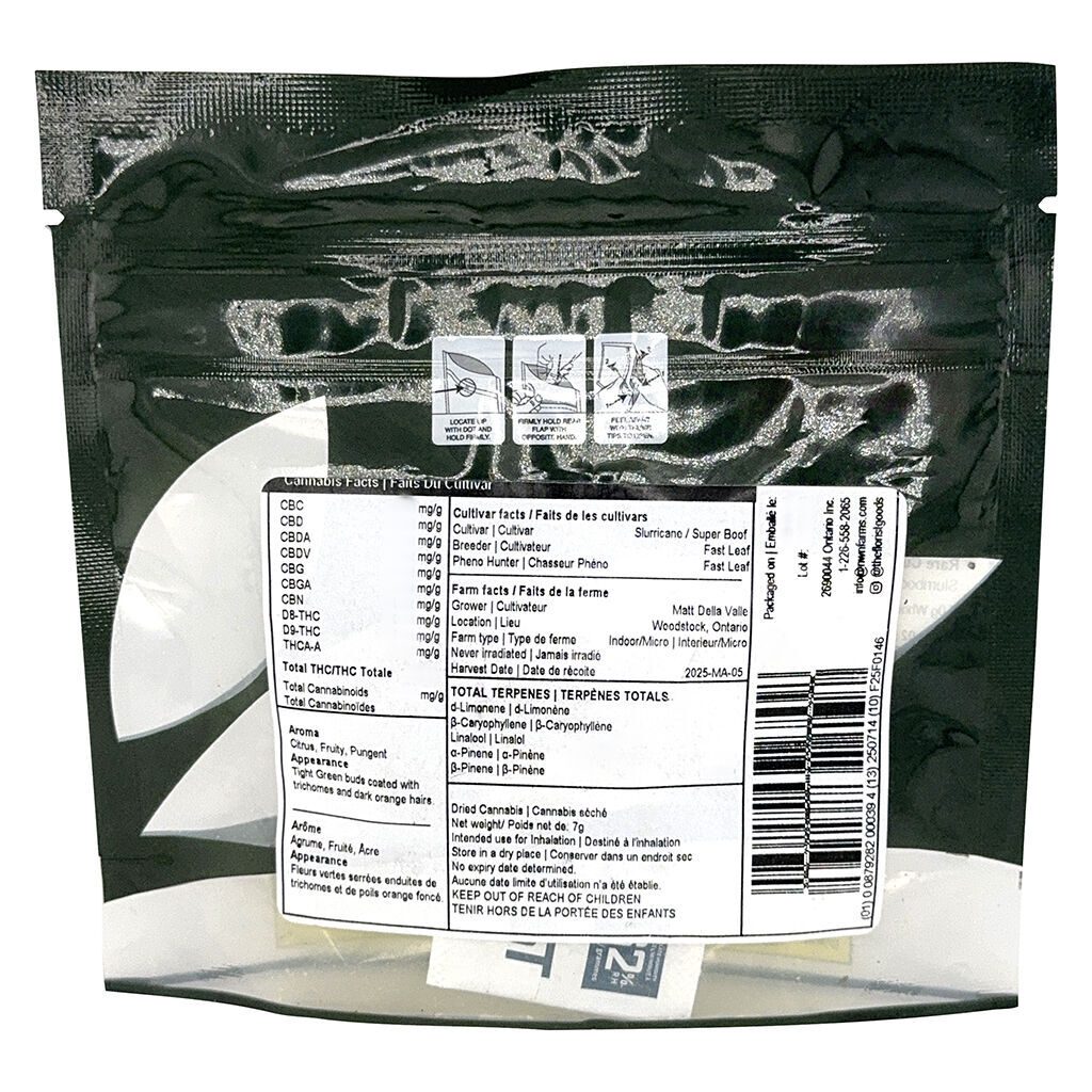 Slurriboof 7g by The Florist is whole dried indica flower with fruity, citrus, and pungent notes, dense frosty buds, and vivid orange hairs for a flavourful, potent experience.