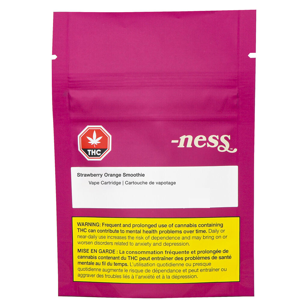 Strawberry Orange Smoothie 510 from -ness is a pairing of Orange Crush x Juicy Fruit offers very strong THC potency potential and that classic combo of creamy, orange and vanilla flavour. -ness distillate is run through our cryo-ethanol extraction process that produces an odourless cannabis oil. This makes an ideal base for the natural, botanical-derived terpenes we add to get strain-specific flavours with no added solvents, pigments, fillers, waxes or phytol.