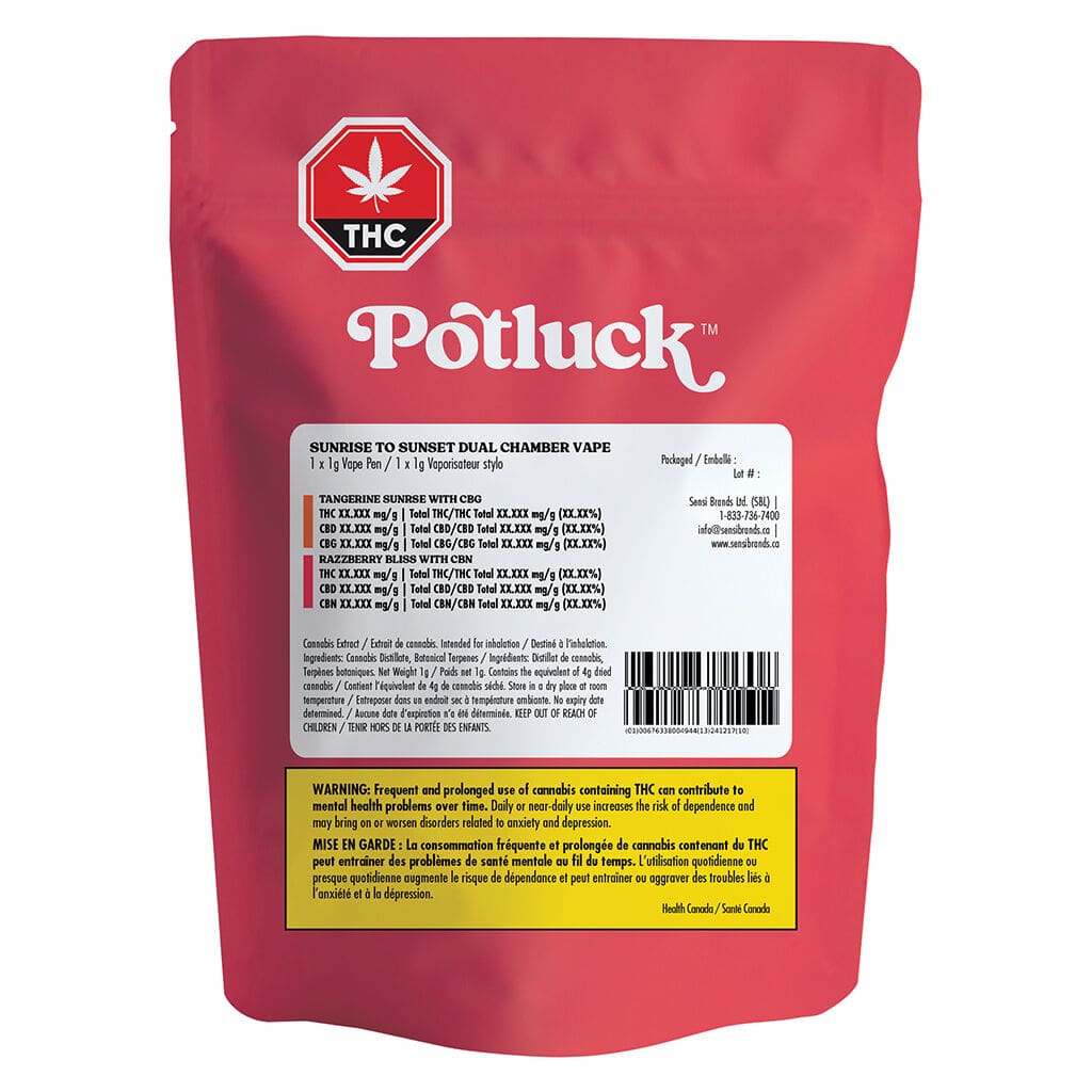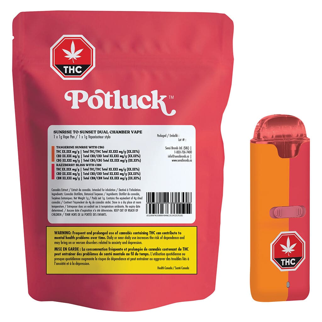 The Potluck Sunrise To Sunset Dual Chamber Vape is a 1g rechargeable disposable featuring two unique blends. Toggle between Tangerine Sunrise (CBG) for daytime energy and Razzberry Bliss (CBN) for nighttime relaxation. With dual-flavor versatility and targeted cannabinoid support, it’s the ultimate all-in-one hybrid. Control your vibe—shop Potluck today.