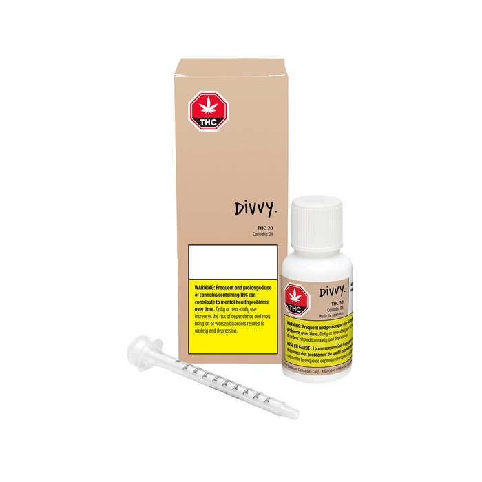 Divvy THC 30 Oil formulated with 30mg/mL THC extracted from Ontario-grown flower and blended with a flavourless pharmaceutical-grade MCT carrier oil. For ingestion only.