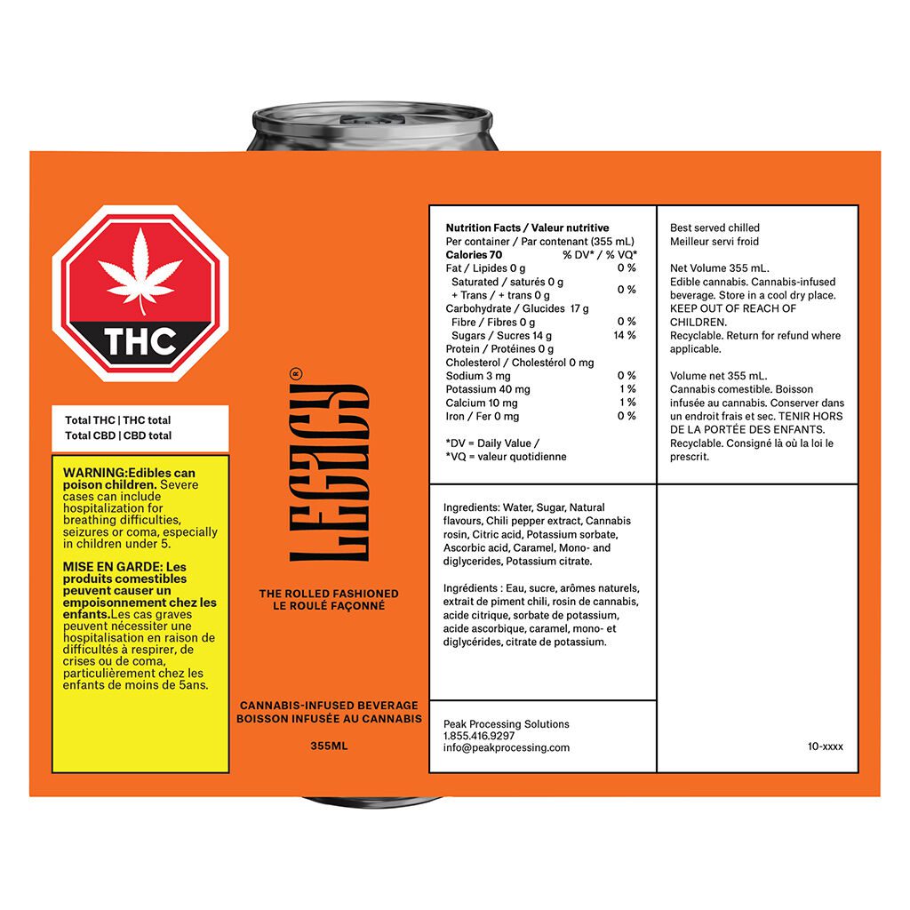 The Rolled Fashioned 355ml by Legacy is a live rosin infused sparkling cannabis drink featuring orange zest, dark cherry, and warming spice with all-natural ingredients.
