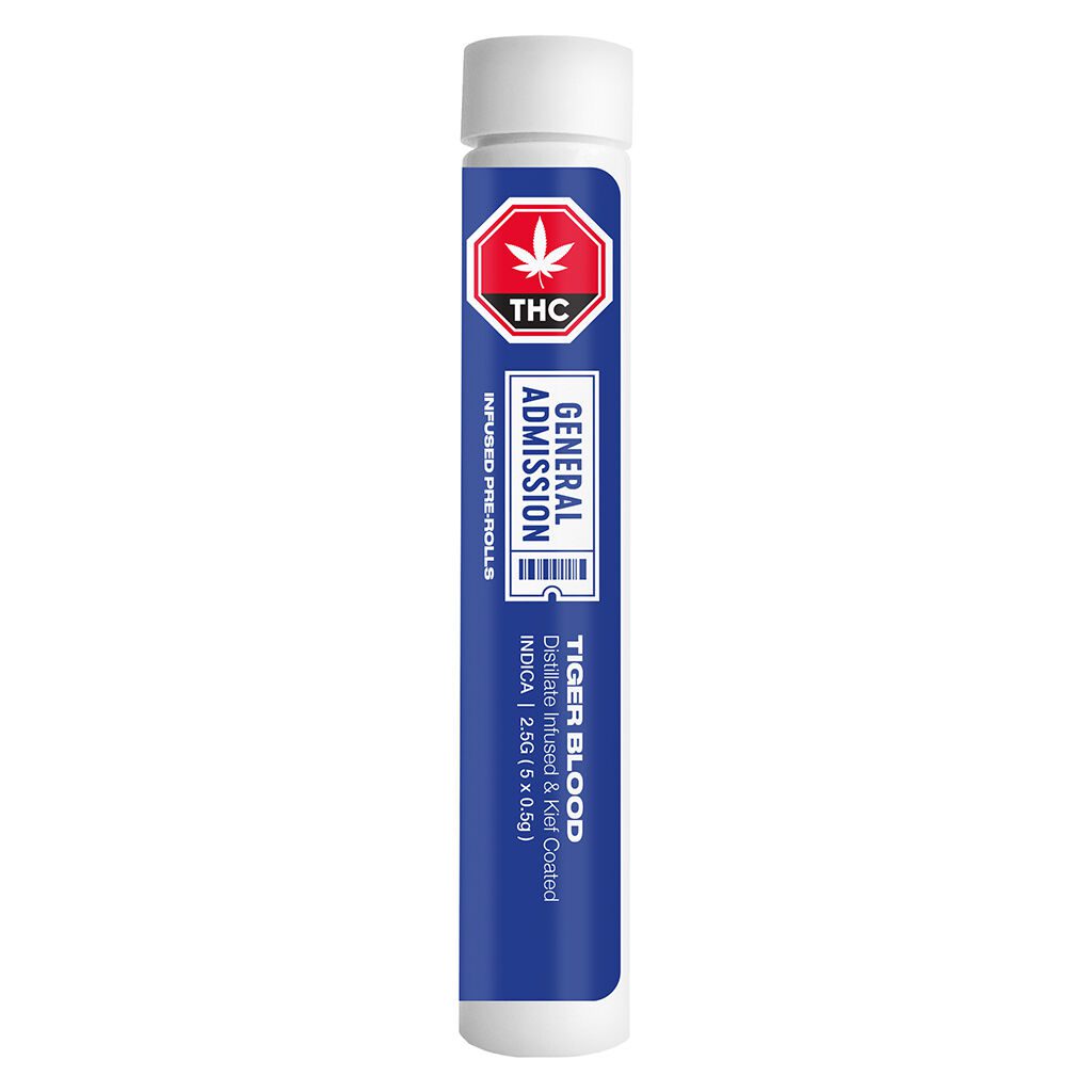 Tiger Blood Distillate Infused Pre-Rolls 5 Pack by General Admission includes 5 x 0.5g indica-dominant pre-rolls infused with distillate, kief, and terpenes for bold tropical flavour.