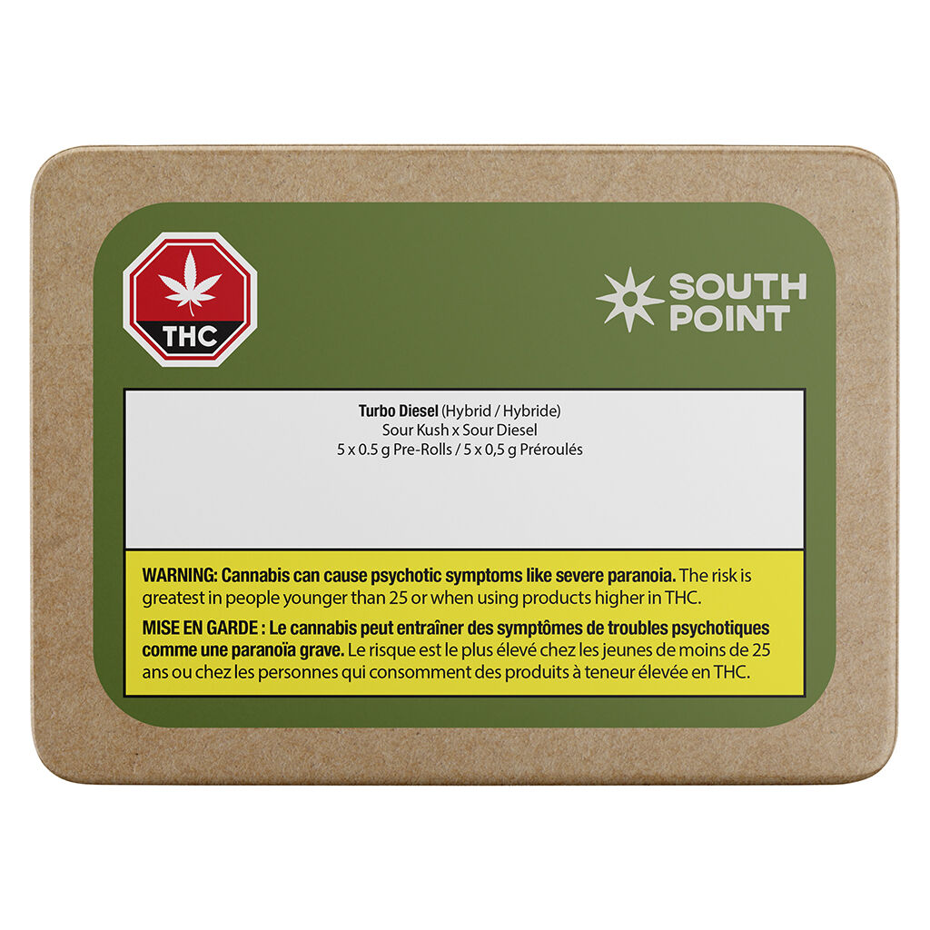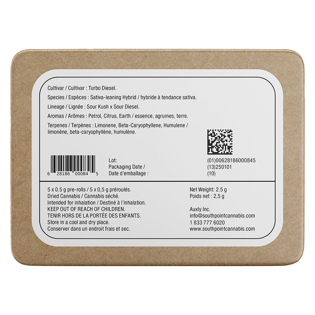 Turbo Diesel Pre-Rolls 5 Pack by South Point are sativa-leaning hybrid joints with whole flower, earthy and citrus aromas, rolled in reefer cones with crown ends for a smooth burn.