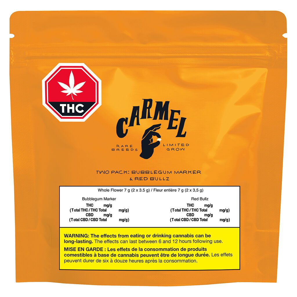 Two Pack: Bubblegum Marker & Red Bullz 7g by Carmel is a 2-strain, 7g flower pack that combines two of Carmel’s most sought-after hybrids in one convenient package. This pack contains 3.5g of Bubblegum Marker and 3.5g of Red Bullz, allowing consumers to enjoy distinct flavour profiles and effects in a single purchase.